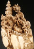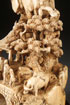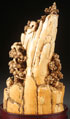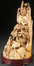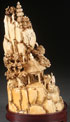 A VERY FINE CHINESE CARVED IVORY MOUNTAIN SCENE, 19TH CENTURY. Fully carved in the round and pierced with pagodas, pine trees, and figures, one atop a water buffalo on a terraced rockery ground with stream at base below a bridge crossed by two figures. Fitted in a carved hardwood stand. Total height 9 inches (23 cm).