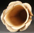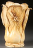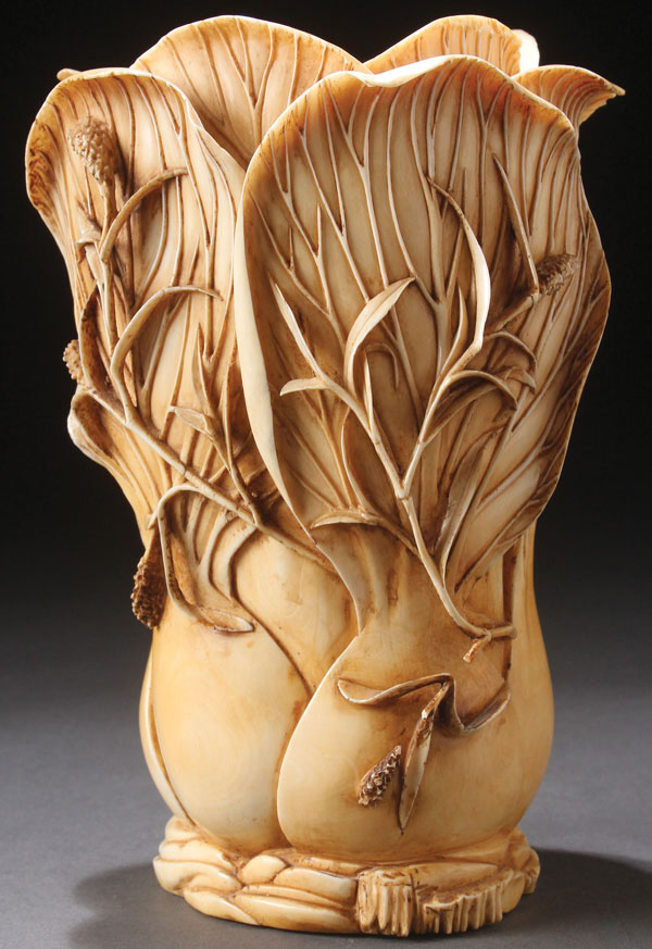 A CHINESE CARVED IVORY "BOK CHOY" BRUSH POT, 19TH CENTURY. Well carved in deep relief with overlapping curled edge leaves each with raised veins and extending bamboo shoots. The verso with a praying mantis devouring a grasshopper. Height 6.75 inches (17 cm).
