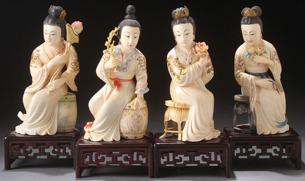 A FINE GROUP OF FOUR CHINESE CARVED AND POLYCHROME IVORY KWAN-YIN, PROBABLY QING DYNASTY, CIRCA 1900. The finely carved seated figures each holding a different floral branch and with polychrome accents raised on open work carved zitan wood plinths. Ivory height 6 inches (15 cm). Total height 7.5 inches (19 cm).
