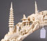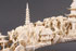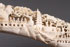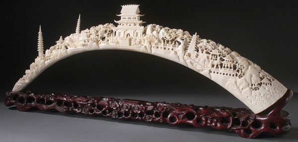 A LARGE CHINESE SCENIC CARVED IVORY TUSK, PROBABLY CIRCA 1900. Crisply carved and pierced with a detailed scene of pavilions, pine trees, and figures in various activities, raised on a carved hardwood stand. The ivory length 36.5 inches (93 cm).