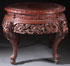 A CHINESE EXPORT CARVED HARDWOOD PARLOR TABLE, EARLY 20TH CENTURY. Of circular form, the top overhanging rim carved with a band of lappets above a floral panel carved frieze raised on four cabriole shape legs. The knees with large extending iris blossoms and flanked by pierce-carved floral skirt panels. Height 32 inches (81.25 cm). Diameter 46 inches (117 cm).