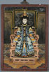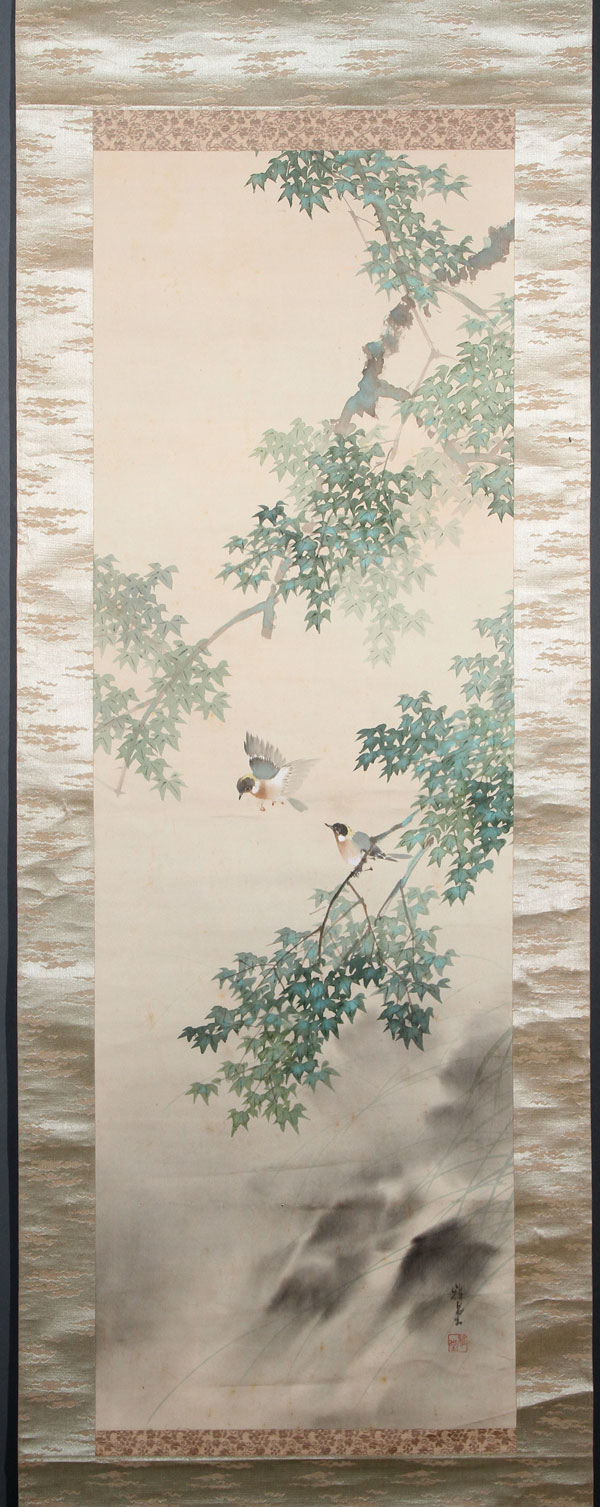 A FINE CHINESE WATERCOLOR ON SILK SCROLL, EARLY 20TH CENTURY. Depicting two birds on spreading foliage with signature and red seal mark lower right, within an applied silk surround. The painting 42.25 inches x 14 inches (107.4 x 35.5 cm). Together with a Chinese reverse painted glass scene of an empress on carved throne. 27.5 inches x 19.5 inches overall (70 x 49.5 cm). (Unillustrated)