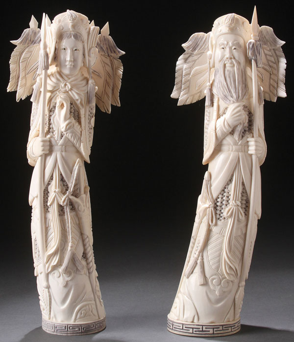 A PAIR OF CHINESE CARVED IVORY WARRIOR IMMORTALS, PROBABLY QING DYNASTY, CIRCA 1900. Each with a bamboo pole and string of fish, incised seal marks on bases. Height 14.25 inches (36.2 cm). (Unillustrated)