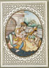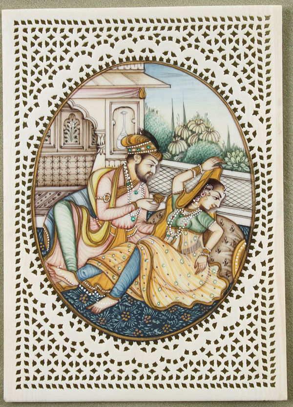 FOUR INDIAN MINIATURE PAINTINGS ON IVORY, INDIA, 19TH CENTURY. Comprising a very finely painted and gilt oval scene of a prince with consort on a rectangular ivory plaque with pierced surround (illustrated), together with a framed group of three painted ivory miniature portraits of a prince and two attendants. The first 4.25 inches x 3 inches (10.8 x 7.6 cm), the others approximately 4.25 inches x 2-2.5 inches (10.8 x 5-6.5 cm).