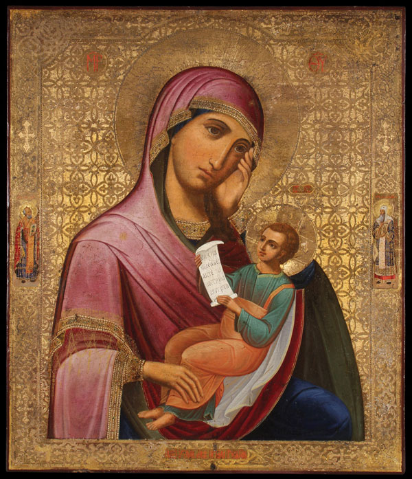 A LARGE AND IMPRESSIVE RUSSIAN ICON OF THE MOTHER OF GOD SOOTHE MY SORROW, CIRCA 1870, POSSIBLY PESHEKHONOV. Sensitively painted on an ornate, incised gilt ground. The veil of the Virgin trimmed in ornate gilt embroidery and embellished with gemstones and pearls, similar to the border saints, and all very typical of the Peshekhonov workshop. The left border finely painted with St. Nicholas and the right border with the Metropolitan Alexei. The lower margin inscribed "IMAGE OF THE SOOTHE MY SORROW MOST HOLY MOTHER OF GOD." 31.5 inches x 26.75 inches (80 x 68 cm).
