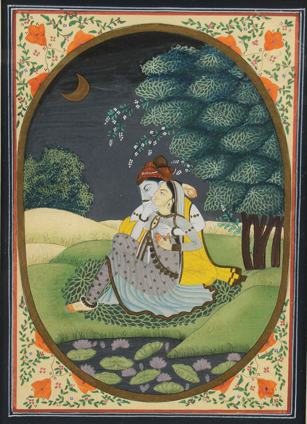 A FINE PAIR OF INDIAN MINATURE PAINTINGS, INDIA, PROBABLY 19TH CENTURY. Depicting a provincial Mughal painting of Shiva and Parvati within an oval with floral border, and a small scene of Krishna with disciples. Each image 9 inches x 6.5 inches (23 x 16.5 cm) and 3 inches x 3.75 inches (7.5 x 9.5 cm), with contemporary frames and mats. (Unillustrated)