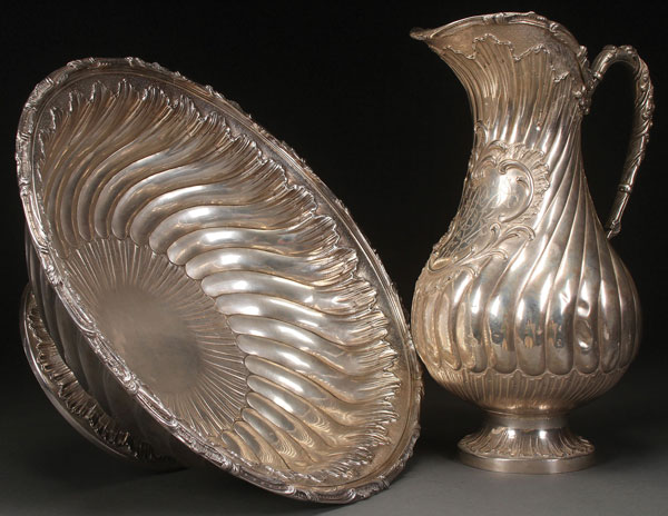 AN IMPRESSIVE AUGUSTIN LAHURE FRENCH SILVER WASH SET, LATE 19TH CENTURY. Comprising an ovoid footed pitcher with repoussed scrolled cartouche reserved on spiral flutes with scalloped terminals. Below an acanthus and bell flower carved handle and with matching basin. Stamped maker's mark and minerva head (.950). Height 14.75 inches (37.5 cm) Diameter 16.875" (43 Cm). Weight 102.6 troy oz.