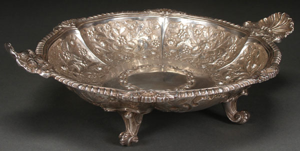 A VICTORIAN SILVER STRAWBERRY DISH. John Angell, London 1825, of circular form with sloping sides repoussed and chased with wild roses in six panels with a gadrooned rim flanked by scalloped handles raised on scrolled cast feet. Hallmarks include maker's mark, lion passant, uncrowned leopard's head, date letter, and Sovereign's head. Diameter 10.5" (26.7 cm). Weight 31.9 troy oz.