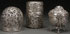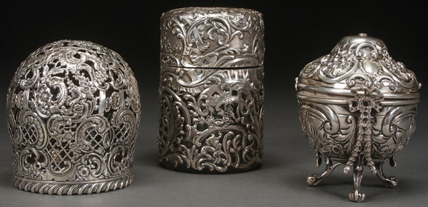A VICTORIAN STERLING SILVER GROUP, 19TH CENTURY. Comprising a finely chased and repoussed silver and cut crystal dresser jar with puzzle-type interlocking lid and two string holders one with reticulated scrolls and florals by Gorham dated 1893, the other a repoussé claw and ball footed by William Comuns, London 1896. The covered jar locked closed and with no exterior visible markings. Height 3.5 inches, 4.25 inches, and 3.75 inches (9 cm, 11 cm, 9.5 cm). Weighable silver 8.47 troy oz.