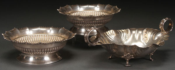 THREE TIFFANY & CO. STERLING DISHES, LATE 19TH, EARLY 20TH CENTURY. Comprising two fluted ribbed and scalloped rim sauce bowls and an ovoid footed bowl cast with bell flower ring handles, each with stamped "Tiffany & Co.", "Sterling-Silver" and with shape numbers 7940 and 6477. Diameter 5.5 inches (14 cm) and length 8.25" (21 cm). Total weight 15 troy oz.