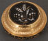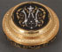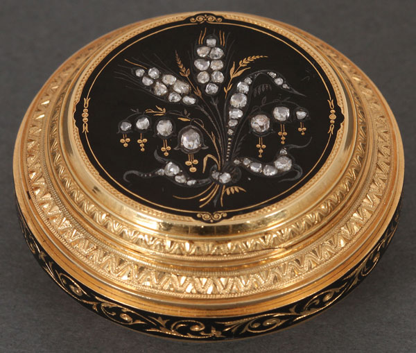 A VICTORIAN 18K GOLD, DIAMOND, AND ENAMELED SNUFF BOX. Of pillow form, the hinged lid with black enameled top inlaid with scrolled foliates surrounding an intaglio cut and gemstone mounted initial “W” containing 50 rose cut diamonds the largest approximately .05 ct. and above a stepped body with chased endless loop bands flanking an intaglio cut waist with inlaid gold scrolled foliates. The base similarly decorated with intaglio cut, gold inlaid and diamond set Lilies of the Valley. The interior stamped 18k within a keystone device and with makers mark “HF” in oval. Diameter 1.825 inches (4.8 cm). Weight 1.59 troy oz.