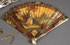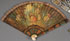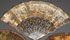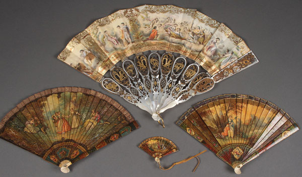 A GROUP OF THREE 18TH CENTURY VERNIS MARTIN IVORY FOLDING FANS. Each decorated with romantic pastoral settings with figures, the cover sticks and fan terminals with medallions and panels of floral bouquets and neo-classic vases. The versos with expansive landscapes. The largest, 12.25 inches in length open (31 cm). The smallest length 3.5 inches open (10 cm) and the miniature, artist signed "Danys." Together with a 19th century French neo-classic gilt embossed paper litho fan with Mother of Pearl sticks and gilt openwork medallions of exotic birds and dogs. Length open 19.5 inches (49.5 cm).