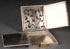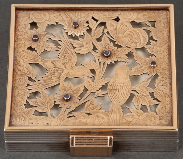 A FRENCH BOUCHERON GOLD, SILVER, AND SAPPHIRE SET POUDRIER (COMPACT), EARLY 20TH CENTURY. Of squared form, the hinged cover with a pierced and chased panel decorated with birds, foliage, and butterfly, opening to reveal two ribbed sliding silver panels for a powder compartment and mirror (absent). The frame inscribed “Boucheron-Paris, BT no 875012” and “G2.128” and with stamped French standard marks including Minerva head, Eagle head, and “OR Argent." 3 inches square (7.5 cm). Weight 7.01 troy oz.