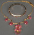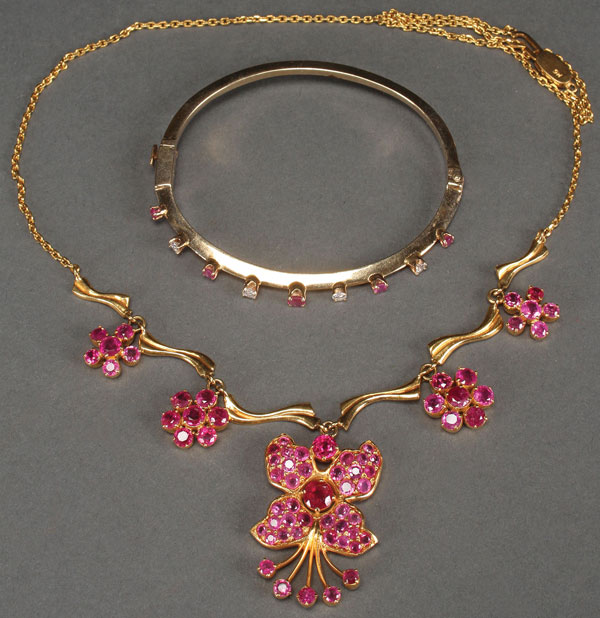 A FINE RUBY AND GOLD NECKLACE AND BRACELET, 20TH CENTURY. Comprising a 14k gold bracelet containing four brilliant cut diamonds approximately .50 total ct. weight and five rubies. Length 2.375 inches (6 cm), interior width, 2.125 inches (5.5 cm). And a gold and ruby butterfly and floral necklace, the pendant butterfly form set with a large central round cut ruby, with wings and antennas accented in rubies, joined with six branch form links with four suspended ruby set rosettes. Stamped initials MG. Butterfly pendant 1.25 inches (32 mm), hanging length as illustrated 10.5 inches (26 cm), total weight 36 grams. (Unillustrated)
