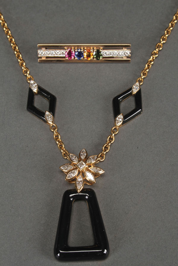 A CONTEMPORARY DIAMOND AND GOLD NECKLACE AND BAR PIN, 20TH CENTURY. Comprising a French Chaumet triangular black onyx and gold mounted pendant suspended from a marquis diamond form rosette, joined with black onyx diamond form links with diamond accents, on an 18K gold chain. The pendant stamped "Chaumet, Paris" and with French Assay marks. Length 17.5 inches (44 cm), weight 24 grams. And a 14K gold, diamond and gem-set bar pin of rectangular form, the center bar with 10 brilliant cut diamonds of good quality, and with four oval cut gemstones in rose, blue, gold and green. Apparently unmarked. Length 1.5 inches (38 mm), weight 5 grams. (Unillustrated)