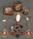 A LADY'S VICTORIAN JEWELRY GROUP. Comprising man and woman's 10k "Grand Tour" micro mosaic rings and a matching pin each depicting the Parthenon, a lady's 10k carved cameo ring, and a pair of yellow and rose gold pendant earrings set with carved coral cameos, seed pearls, and freshwater pearls, together with a Siamese silver brooch with bloodstone and rouge marble inlay. (Unillustrated)