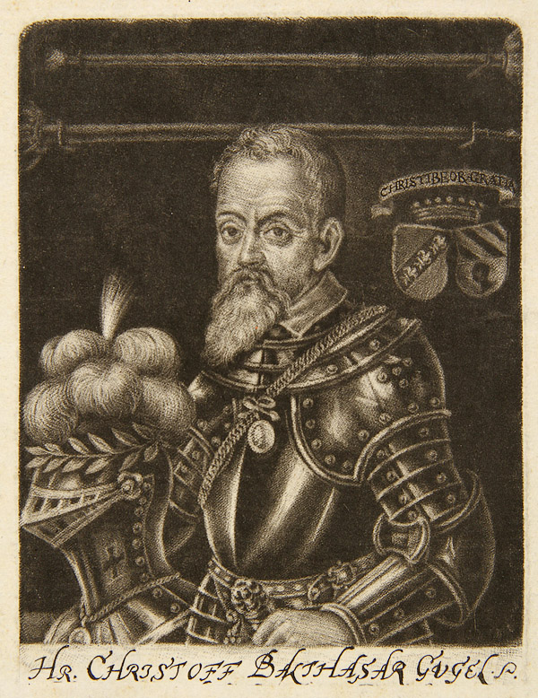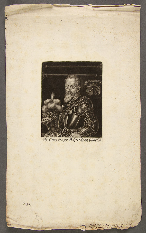 OLD MASTER MEZZOTINT PRINT, CIRCA 1690, BY GEORGE FENNITZER (GERMAN 1646-1722). Depicting a waist-up portrait of Christoph Balthasar Gugel (1536-1575) shown wearing a full suit of armor and with heraldic shield in background. Inscribed beneath image, Hr. Christoff Balthasar Gugel P. Printed on laid paper with full margins. Impression size 5.25 inches x 3.25 inches (13.5 x 8.6 cm). Sheet size 12.4 x 7.5 inches (31.5 x 19 cm). Unframed.