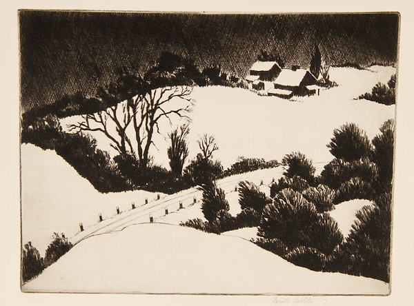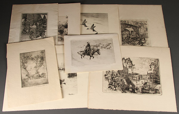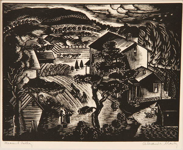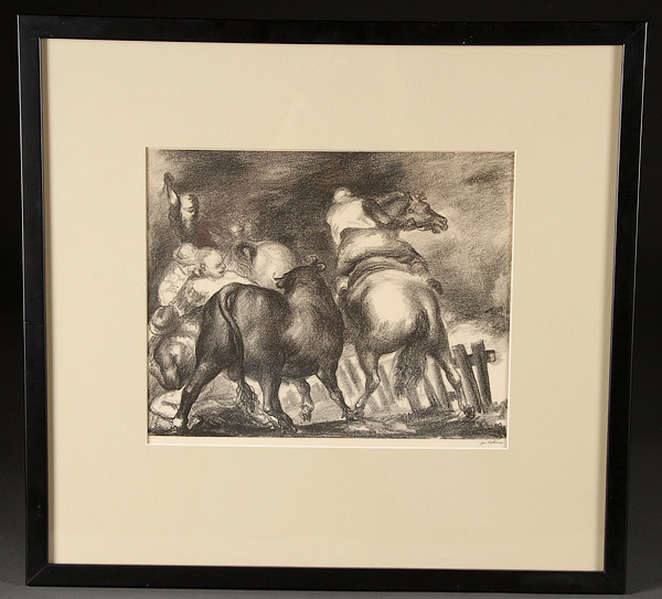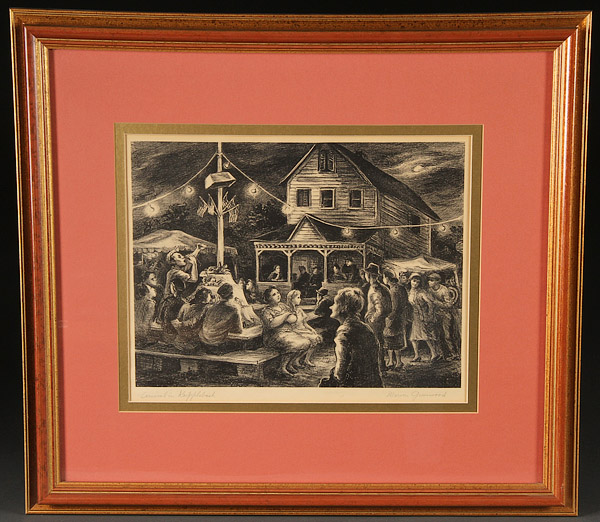 A GROUP OF SEVEN ASSOCIATED AMERICAN ARTISTS (AAA) LITHOGRAPH PRINTS. Comprising Marion Greenwood (American 1909-1970) Carnival of Kripplebush, pencil signed lower right, image size 9.25 inches x 12.25 inches (23.5 x 31.1 cm), framed; Jon Corbino (American 1905-1964) Escaped Bull, pencil signed lower right, image size 10.75 inches x 13.75 inches (27.3 x 34.9 cm), framed; two duplicate prints by Alexander S. Masley (American 1903-1996) Pleasant Valley, both pencil signed lower right, image size 7 inches x 9 inches (17.8 x 22.9 cm), both unframed; Frederico Cristencia Castellon (American 1914-1971) The Family-1946, pencil signed lower right, image size 7.5 inches x 11.75 inches (19 x 29.8 cm), unframed; two duplicate prints by Lowell Bobleter (American 1902-1973) Silent Night, both pencil signed lower right, image size 7.5 inches x 9.75 inches (19 x 24.8 cm), both unframed, together with an envelope of 11 unframed prints by Reinhold H. Palenske (American 1887-1975) and others, image sizes 6.75 inches x 4.74 inches (17.1 x 12 cm) to 10 inches x 7.75 inches (25.4 x 19.7 cm).