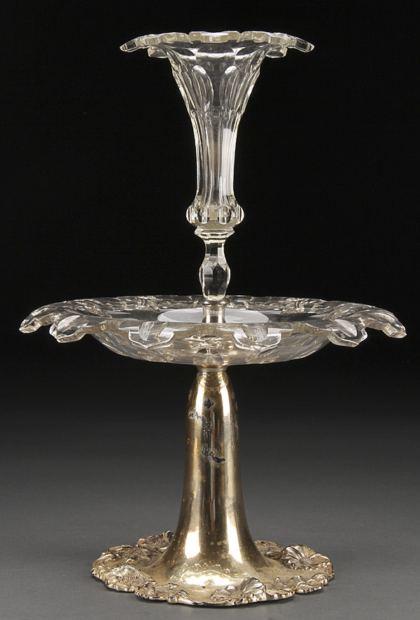 A FINE AMERICAN QUADRUPLE PLATE AND CUT GLASS CENTERPIECE EPERGNE, THIRD QUARTER 19TH CENTURY. By Delphi Silver Co. with flaring floral relief base supporting a cut glass low bowl with center lily form vase. Height 15.5 inches (39.5cm).
