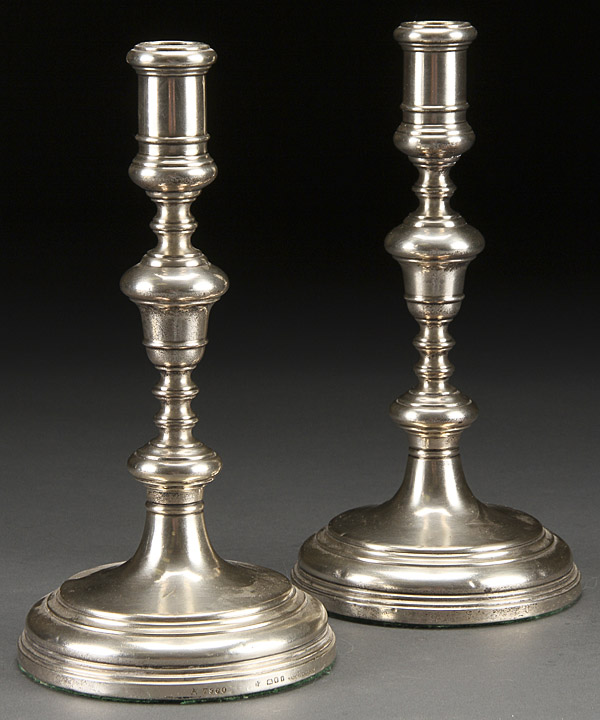 A THREE PIECE SILVER CANDLESTICK GROUP, EARLY 20TH CENTURY. Comprising a pair of English George II style candlesticks by Charles and Richard Comyns, London, 1923; together with a sterling weighted candle stand with etched glass hurricane shade. Height 16.25 inches (41.4 cm) and 9.25 inches (23.3 cm).