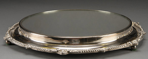 A VICTORIAN STYLE MIRRORED PLATEAU. With embossed decoration on rim. Diameter 16 inches.