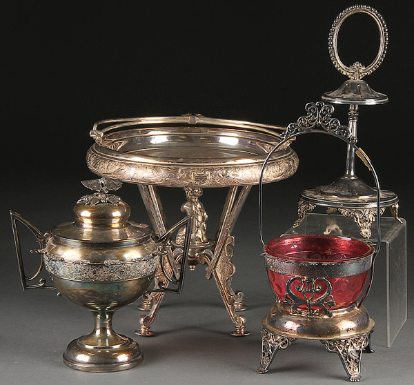 A FOUR PIECE VICTORIAN SILVERPLATE TABLEWARES GROUP, 19TH CENTURY. Comprising a New Haven figural basket/stand with putti, a lidded sugar bowl, spoon holder with moth finial, a cranberry insert sugar bowl, spoon holder sans lid and a knife caddy. The largest 10 inches (25 cm) excluding handle.