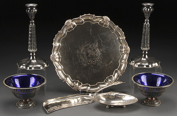 A VERY FINE SHEFFIELD AND QUADRUPLE PLATE SILVERED TABLEWARES GROUP, 19TH/20TH CENTURY. Comprising a large Georgian silver on copper salver, a fish server with marks of George Richmond Collis (1835-1888), a pair of reticulated fruit bowls with cobalt inserts, a pair of Homan cut crystal stemmed candle sticks and a clam shell shaped tray. The largest diameter 12 inches (30.5 cm).