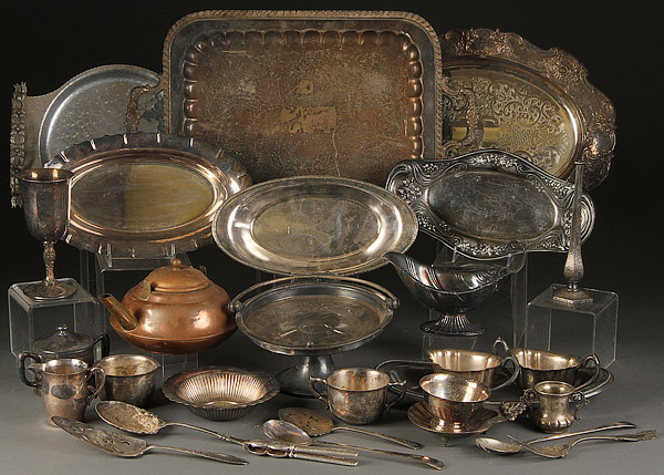 A ROGERS, POOLE, TOWLE AND WILCOX CO. SILVERPLATE GROUP, 20TH CENTURY. Consisting of a large handled tray by Rogers, assorted tablewares including creamer, sugars, and small serving trays. Together with various flatware items by Rogers, Wellner, National Silver Co. and more. Over 75 total pieces. Length 3 inches to 21 inches.