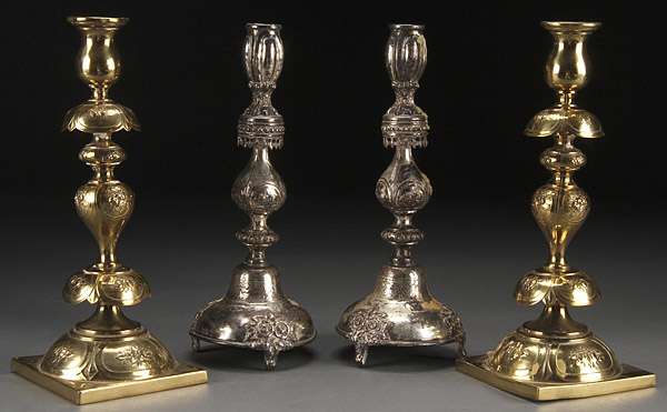 TWO PAIRS OF WARSAW JUDAICA CANDLESTICKS, 19TH CENTURY. One pair in silvered metal marked "BR Buch", the other with silvering removed and stamped "Nobbling & Co." Both pairs marked "Warsaw" and with embossed floral designs. Height 12 inches (30.5 cm).