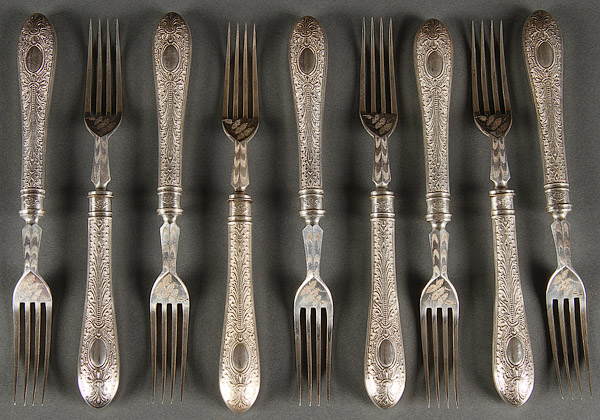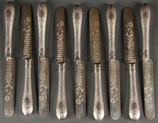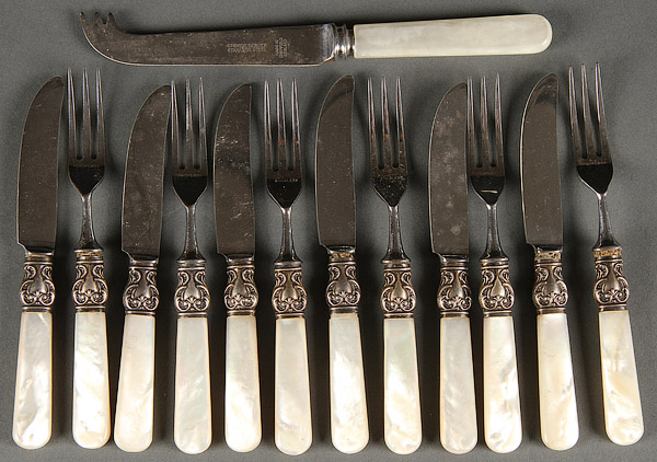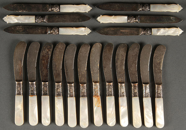 A GROUP OF VICTORIAN SILVERED AND MOP DESSERT FLATWARE, 19TH CENTURY. Comprising a set of 18 silvered knives and forks (8 each) with finely embossed handles and floral engraved blades. Each with embossed English registry marks, a 25 piece set of MOP handled ware comprising 7 forks, 6 knives, and 12 individual butters marked "Universal L*G". A set of 12 sterling mounted MOP handled wares comprising 6 forks and knives marked "sterling" and "North Hampton" each and six MOP handled Sheffield fruit knives with foliate carved terminals.