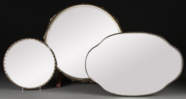 THREE VICTORIAN MIRRORED PLATEAUS. Comprising a gilt rococo base with beveled mirror, a modified oval with silvered base and a small embossed copper rimmed. The largest diameter 16.5 inches (42 cm).