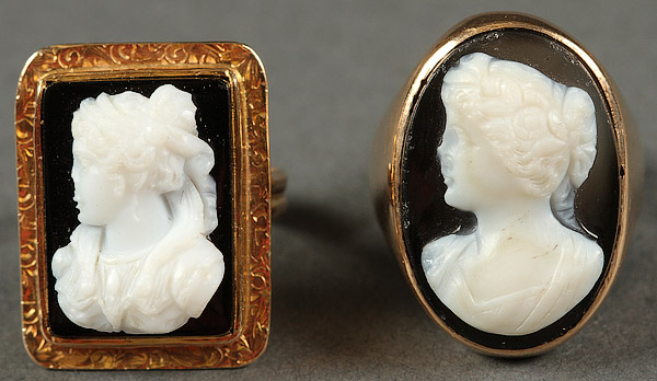 TWO GOLD CAMEO RINGS, EARLY 20TH CENTURY. Each with a carved white opaque profile bust of a young beauty on a topaz ground, one stamped 10K.