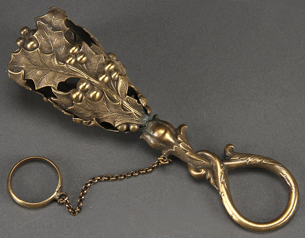 A FINE VICTORIAN BRONZE TUSSIE MUSSIE POSEY OR NOSEGAY HOLDER/VASE. Finely embossed with an open work cone form of holly leaves and berries, scrolled handle and finger ring chain. Length 5.5 inches (14 cm).