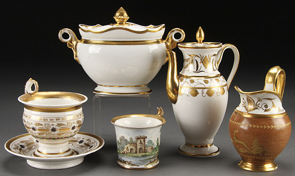 A DRESDEN AND OLD PARIS PORCELAIN GROUP, EARLY TO MID 19TH CENTURY. Comprising Dresden cream jug scene of a fox hound and gilt scrolls, a fine gilt decorated chocolate pot with Napoleonic bee, hand painted scenic mug, covered sugar and cup and saucer with polychrome florals and gilt scrolls and ferns. The largest 9 inches (23 cm).