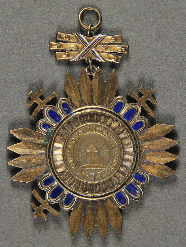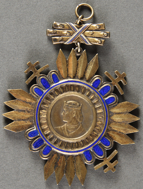 RARE SLOVAKIAN ORDER OF PRINCE PRIBINA, GRAND OFFICERS CROSS, CIRCA 1942. Silver gilt and enameled with suspension device. Minor loss of lower left cross form. Indistinguishably hallmarked in two places (see photos). Greatest width 66mm, greatest height 77mm (including ribbon tied suspension device).