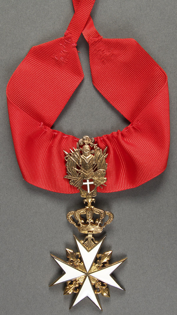 ORDER OF MALTA KNIGHT’S CROSS. Silver-gilt metal and enamel. Width of cross 52 mm. Suspended from red moire silk neck ribbon.