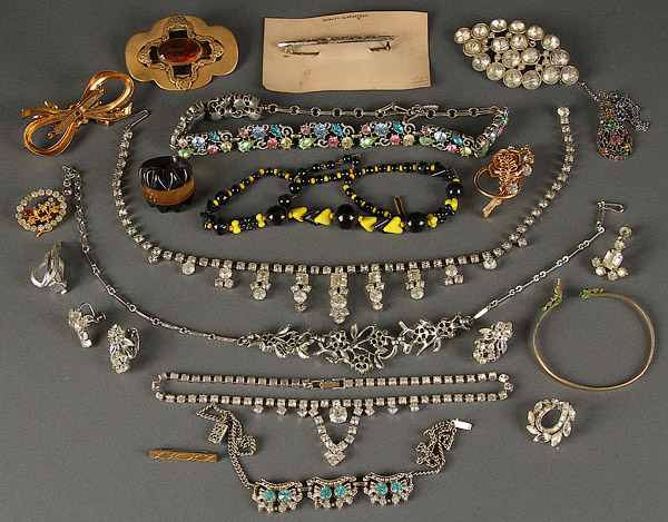 A GROUPING OF CORO, SARA CSV AND OTHER COSTUME JEWELRY, EARLY TO MID 20TH CENTURY. Over 16 items including a Coro ribbon design pin, pair of Sarah CSV floral form clip-on earrings, together with a clear stone necklace, various other colored/clear stone necklaces, together with multiple other clear stone earrings, necklaces and pendants along with a Bakelite style pendant and non-matching necklace.