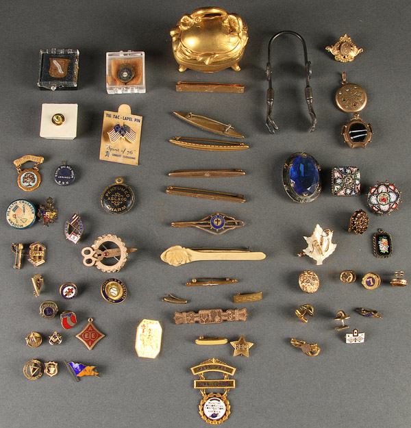 A VICTORIAN JEWELRY GROUP. Over 25 pieces including a small gilt dresser box, lapel pins, mosaic pins and various lockets together with later period enameled fraternal and organizational pins and gold filled items.