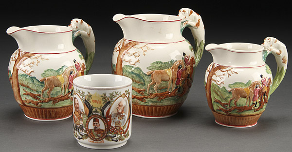 A THREE PIECE SET OF WEDGWOOD HUNT SCENE SERIESWARE, 20TH CENTURY. Together with a German coronation mug. The largest 6.75 inches (17 cm).