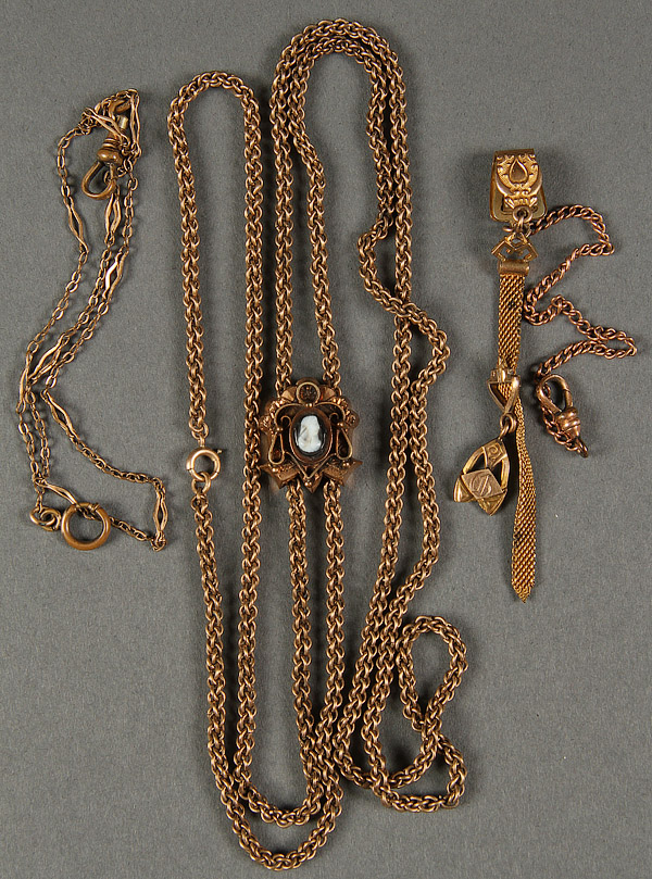 A VERY FINE LADIES VICTORIAN WATCH SLIDE AND CHAIN WITH CARVED SHELL CAMEO. Length 21 inches. Together with two additional gold filled watch chains.