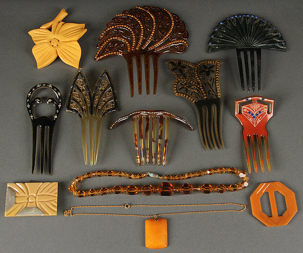AN ART DECO HAIR COMB COLLECTION, EARLY 20TH CENTURY. Seven pieces comprising jeweled faux tortoiseshell and early plastic overlays together with an amber Bakelite pin and pendant and Czech cut glass amber necklace. The largest 5.75 inches (14.5 cm).
