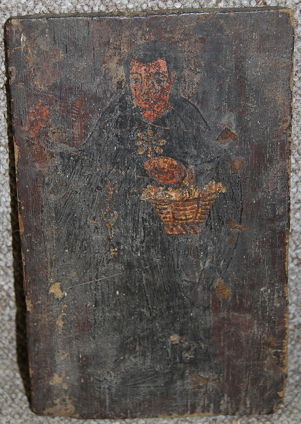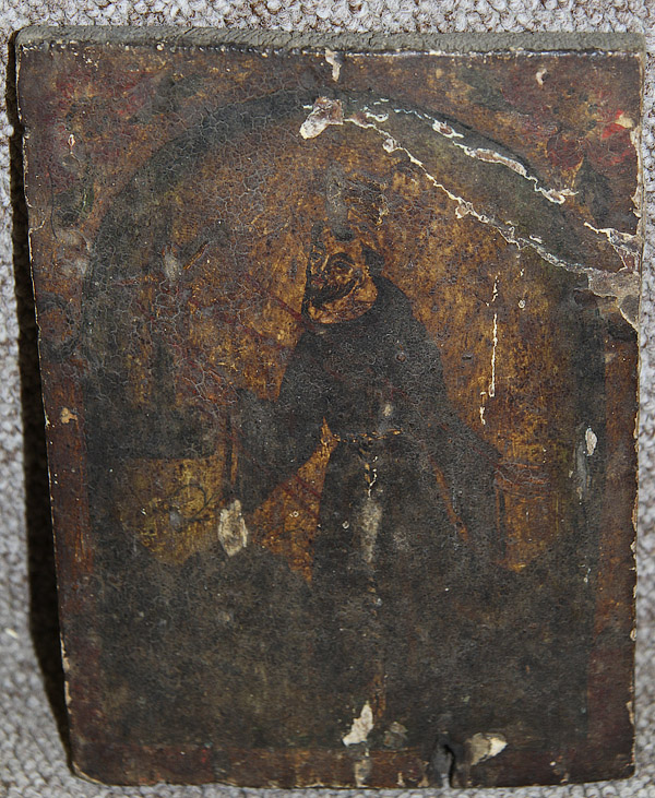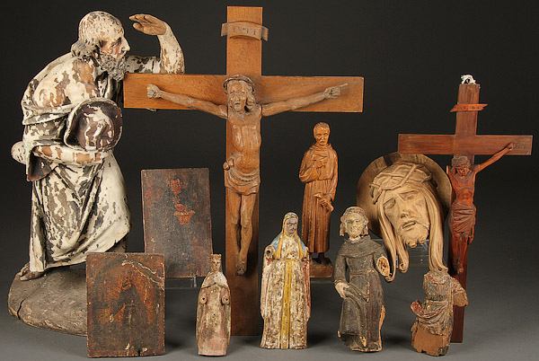 A GROUP OF NINE CARVED RELIGIOUS SCULPTURES, CIRCA 1800-1900. Including a large carved wood figure of a shepherd from a Nativity group, two crucifixes, Santos, and a carved face of Christ. Together with two Southwest or New Mexican style painted wood retablos. In various states of condition including losses. The largest height 25.75 inches (65.4 cm).