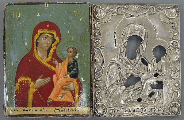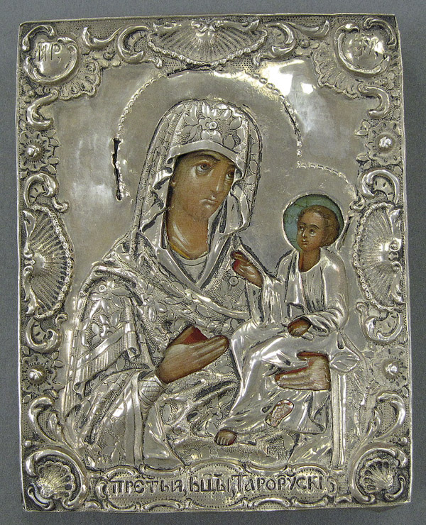 A RUSSIAN ICON OF THE STARORUSKIA MOTHER OF GOD, CIRCA 1846. Traditionally rendered, this Hodigetria variant first appeared in the year 1578 near Novgorod. The lower margin inscribed in Old Church Slavonic, “The image of the Most Holy Mother of God Starorusskia.” Overlaid with a silver repousse and chased riza (sans halo), hallmarked St. Petersburg, dated 1846, indistinguishable maker’s mark and 84 silver standard. Interestingly, the silversmith who crafted the riza, accidentally left out the letter “S” from the beginning of the title “S”tarorusskia- thereby spelling instead “Tarorusskia.” The verso also covered in velvet. 5 inches x 3.8 inches (12.5 x 9.5 cm).