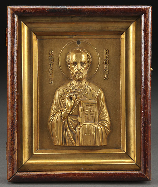 A GILT BRONZE CAST RELIEF RUSSIAN ICON OF ST. NICHOLAS, CIRCA 1900. Icon 7 inches x 5.25 inches (17.5 x 13.4 cm), overall 10 inches x 8 inches (25.2 x 20.6 cm).