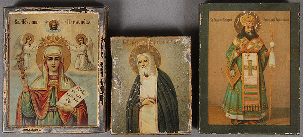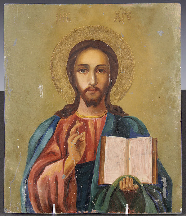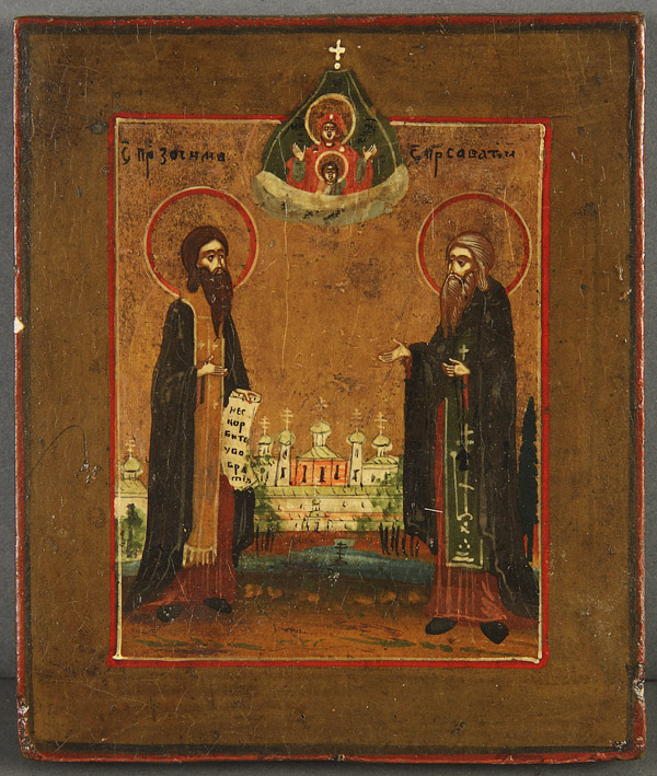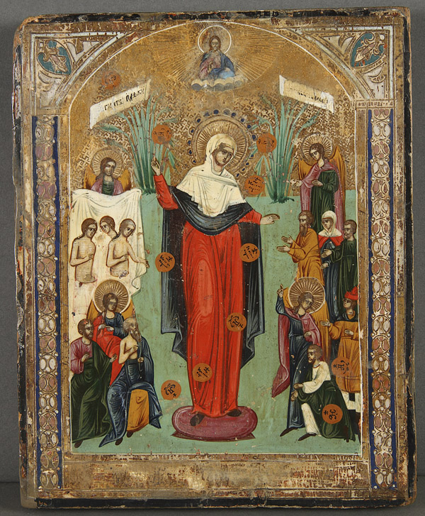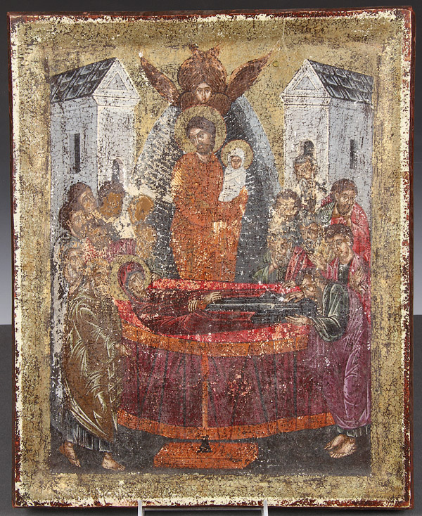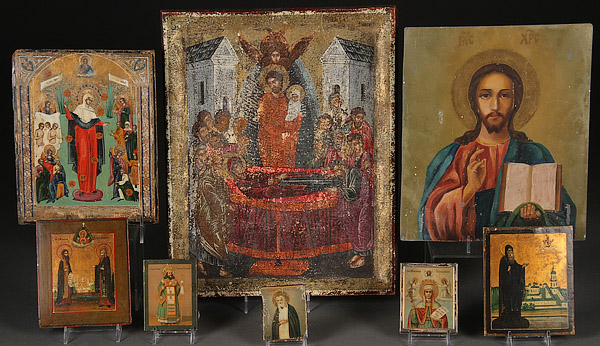 A GROUP OF EIGHT RUSSIAN AND GREEK ICONS, 19TH/20TH CENTURY. Comprising the Joy to All Who Sorrow Mother of God with coins, a Greek icon of the Dormition in the 15th century style, an icon of the Lord Almighty on zinc, icon of St. Zosima and Savatie, and other smaller icons. Some tin lithographs. The largest 14.75 inches x 12 inches (37.5 x 30.5 cm).