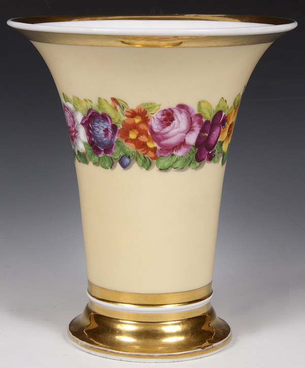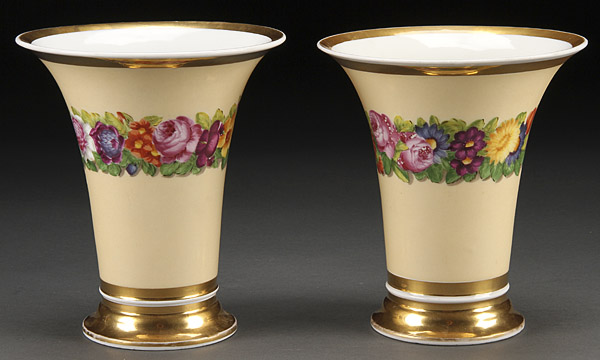 A FINE PAIR OF BERLIN OR KPM HAND PAINTED PORCELAIN VASES, CIRCA 1830'S. Of cylindrical form with flared rims, with hand painted florals on an ivory ground with gilt decorated rims. Height 7.25 inches (18.5 cm).