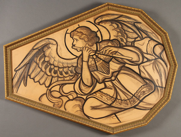 A STAINED GLASS WINDOW CARTOON. Depicting an angel playing a musical instrumentl, 19th century. 31 inches x 44 inches (111.7 x 78.8 cm).