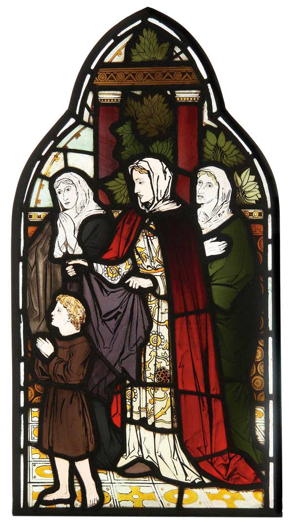 A STAINED AND LEADED GLASS WINDOW, 19TH CENTURY. Comprised of a single panel depicting a group of three women with one placing a cloak on a young child, perhaps the three virtues Faith, Hope and Charity. 29.25 inches x 15.5 inches (74 x 39 cm).