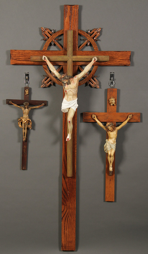 MADONNA, JESUS AND CRUCIFIXES. A LOT OF SEVEN RELIGIOUS SCULPTURES, CIRCA 1890-1950. Comprising seven cast in polychrome plaster lifelike statues of the Virgin of the Immaculate Heart, the Sacred Heart, and three crucifixes; in various states of condition, with some loses and repairs. Largest 60 inches x 29 inches (152.5 x 73.7 cm).