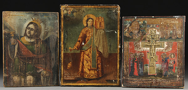 A GROUP OF RUSSIAN AND GREEK ICONS, 19TH CENTURY. Comprising a Ukrainian or southwest Russian icon of the martyr St. Barbara, 13.75 inches x 10 inches (35 x 26 cm); a Greek icon of St. Stephan signed lower left, height 15.5 inches x 11.5 inches (39 x 29 cm); and a Russian icon of the Crucifixion, circa 1800, the upper left corner with the Resurrection, and the upper right with four saints, the lower borders with the apostles Peter and Paul, and the center of icon set with a cast bronze crucifix with inset brass cross, 13 inches x 11.25 inches (33.2 x 28.5 cm).